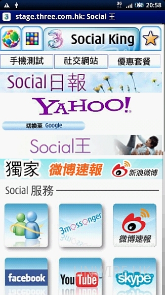 3香港,宣佈與香港新浪網合作,全港獨家推出首個獲得認證的「微博速報」服務,讓追星族全天候在手機以MMS無限接收偶像最新微博。此外,客戶更可選用「Social王」內的www3-Social Unlimited月費計劃,每月只需$38便可無限瀏覽新浪微博,關注偶像最新消息,全天候搶沙發,做個真正「Social王」。