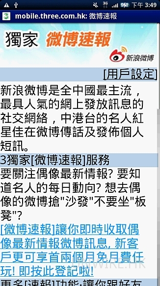 3 香港推出首個獲得由新浪網認證的新浪微博提示服務-「微博速報」,可將偶像發表的微博以MMS方式送到手機,實行全方位大關注。透過特別技術,將每個新發表的微博內的文字及相片,以MMS方式送到各粉絲的手機,更無需支付本地數據費用,最關注偶像及朋友的最新微博一目瞭然。客戶可選擇以MMS無限接收多達100位新浪微博用戶的最新微博#。「微博速報」每月收費只需$8,首次申請更可享兩個月試玩,免費追縱偶像最新消息。