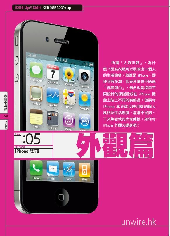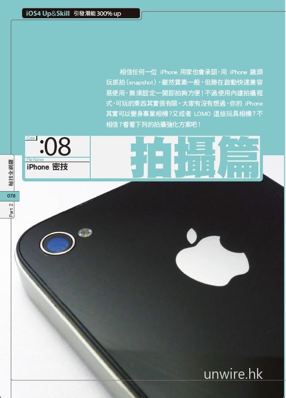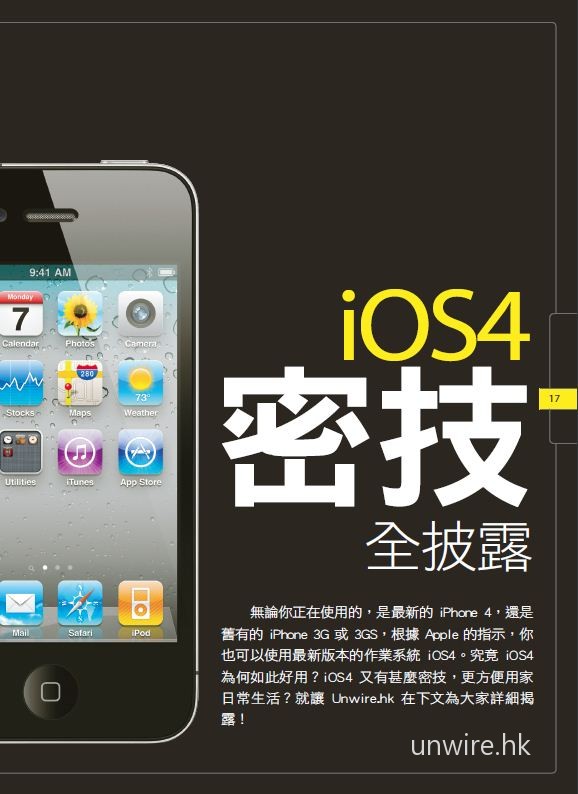 unwire.hk 第一本精心打造的 iPhone 天書終面世了 。 iPhone 只適合玩遊戲?非也!近八成的 iPhone 用家未用盡 iPhone的真正潛能,盡用 iPhone 可成為自己生活上的好幫手甚至是生財工具。巿面上 iPhone 工具書多不勝數,很多只是將 App 介紹搬字過紙,跟本沒有真正照顧用家所需。有見及此 unwire.hk 團隊精心挑選了 50+ 的 iPhone 密技,無論你是 iPhone 3G/ 3GS 甚至乎最新 iPhone4 的用家,看完此書後必定會大大提升你手中 iPhone 的實用性,做到一般 iPhone 用家所做不到的事!