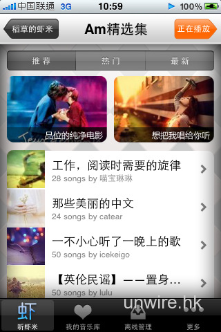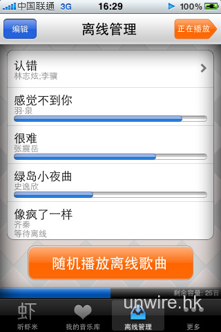 「蝦米音樂」網站上提供了海量歌曲分享,只要在iPhone上裝上了這個「蝦米音樂」App便能夠使用WiFi或3G數據連線來收聽各種歌曲。雖然是來自內地的網站,身為香港的用家也別擔心沒歌聽,因為「蝦米音樂」提供的除了內地歌曲外還有港台流行榜和大家熟識的勁歌金榜。歌曲更新算快,很多新歌都能找到。除了在線收聽之外,還支援離線收聽。所以如果身處在連線不穩定的地方就可以先把歌曲下載回來,然後慢慢聽。不過有個限制,就是目前版本最多只可以離線50首歌曲。