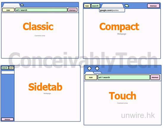 Google 正計劃對 Chrome 的介面再次進行改版。Chrome 瀏覽器的介面本來就以精簡揚名,讓用戶能使用最大的空間,專注網頁內容。據 ConceivablyTech 報道,Google 正為下一代 Chrome 研發四種瀏覽模式,包括把網址列(Address Bar)取消的 Compact 模式。