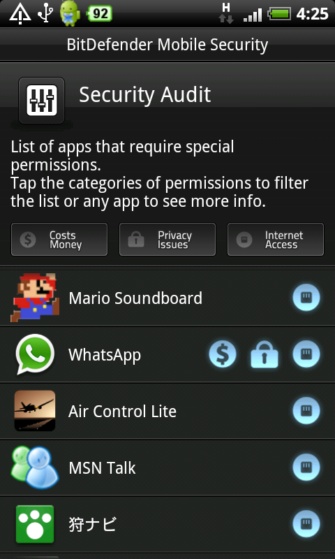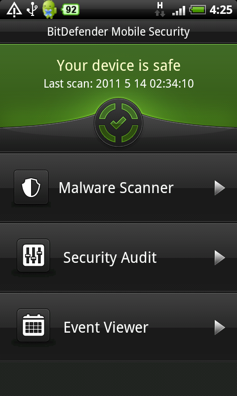 病毒及惡意程式不是電腦的專利,例如之前在 Market 中發現了 50 個 App 包含了名為 DroidDream 的惡意程式,它有可能竊取手機中的資料,或因自動下載木馬程式而做成巨大的數據用量,Google 已經把這些 App 從 Market 中刪除。不過有不少用戶會利用其他網站或工具下載 App,潛藏一定風險,要進行危險性活動,可安裝《BitDefender Mobile Security》,做一下安全措施。它利用雲端技術,由遙端引擎為已安裝的 App 進行 On-demand 掃描,檢查有沒有包含惡意程式,一有發現用家就可以即時刪除。