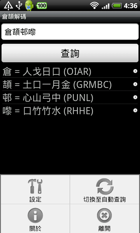 應用軟件 應用軟件 Android App [Android] 倉頡碼查詢 -《倉頡解碼》 作者 遊子 發佈日期 2011-06-30 閱讀時間 1分鐘 字體大小 A A A 分享 讚好 0 0 個讚 分享 複製連結 WhatsApp Facebook Threads 對於老手來說,倉頡拆碼應該毫無難度,但遇上一些較少用的難字,又或是初學者來說,有時真的想不起來,借用《倉頡解碼》在手機上以其他輸入法打出或手寫寫出文字,就能即時顯示文字的倉頡碼。而且它可以連線到網站查詢該字在其他輸入法的編碼,以及字眼的解釋。 軟件名稱:《倉頡解碼》 售價:免費 系統:Android 1.5 或以上 檔案大小:292KB 下載網址:https://market.android.com/details?id=hk.wing.cjcode androidapp