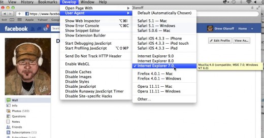Facebook的Timeline新介面,有不少人(包括筆者我)也覺得難以閱讀,但又不能還原,該怎麼辦?最近,有人發現Facebook停止了對Microsoft Internet Explorer 7的支援,也就是說,如果用IE7的話,就不會顯示出Facebook的Timeline介面,而是我們所熟悉的舊介面。所以,憎恨Timeline的朋友們,可以試試轉用IE7。至於用Mac的朋友們則更簡單,在Safari中開啟進階選單,就能讓Safari「扮IE7」,也有同樣的效果。