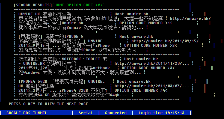 這個 Google BBS Terminal 以 JavaScript、HTML 5、CSS 和 Fixed Excelsior 3.00 Truetype 等字型組成,除了讓大家可以回憶 Modem 撥號的沙沙嗶嗶聲外,Google Search 的功能是真的可以使用的! 80 年代的 unwire 會是怎樣呢?(笑)