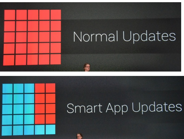 縮小的還有更新檔的容量。Android 用家都會知道,每次更新 Apps 時其實是把整個 Apps 重新下載和安裝,既浪費 3G / 4G 流量,也耗損電力。Google 表示,將會推出 「Smart Update」,往後只需下載和安裝更新的部份,預計比現時可減少三份一的更新容量。Google 還向各位 Apps 開發者大派定心丸,這一個步驟 Google 會自己負責,大家不用擔心。