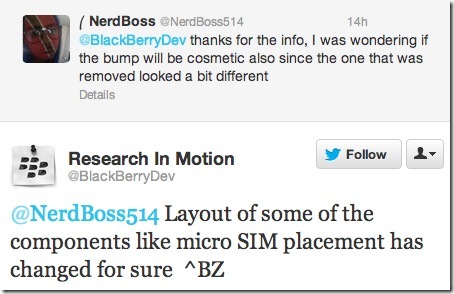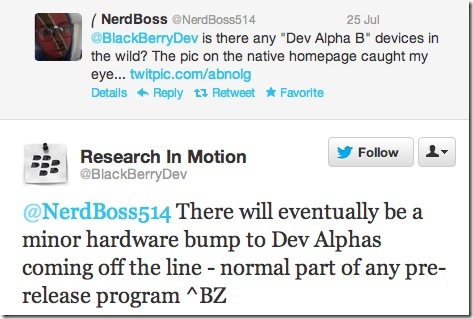 這部 Dev Alpha B 的諜照,是由一名 Twitter 用家 @NerdBoss514 流出,他在 @BlackBerry Dev 的 Twitter 戶口中張貼這部手機的相片,並向 BlackBerry 詢問這部謎之手機的資料,及後他收到回應,指出這部手機名為 Dev Alpha B,並會取代現時的 Dev Alpha 裝置。他更進一步向 BlackBerry 詢問這部 Dev Alpha B 是否純粹改變外型,還是會有主要改變,他及後取得回應,指出 Dev Alpha B 的內部設計與早前的 Dev Alpha 相比有少許不同,而新裝置的 MicroSIM 插槽位置,亦與舊裝置不同。