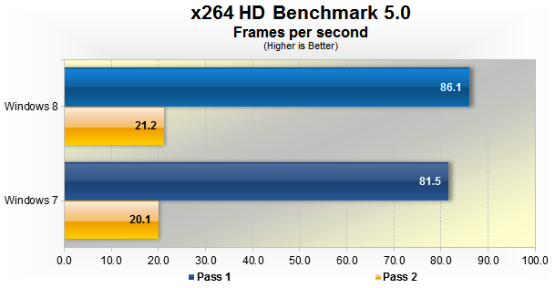 Windows 8 在壓片上效能亦有優勢,2-pass 壓縮上見到第一次壓片更加快速,而第二次壓縮因內容已放入記憶體部分,所以較少分別,但亦証明 Windows 8 對於處理器的優化也有明顯改善。