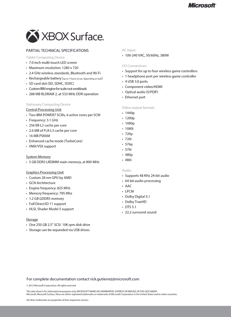 早前我們曾為大家報導過傳聞 Microsoft 將會再接再厲,於來年推出採用 7 吋屏幕的 XBOX Surface,並主攻遊戲市場,今日在網上就流傳出一張相片,疑似是 XBOX Surface 的官方規格表,上方不但有 Microsoft 及 XBOX 的標誌及品牌名稱,還寫著它擁有一部「主機」,當中採用了特製的兩枚 IBM POWER7 SCMs 6 active cores per SCM 處理器,而時脈亦高達 3.1GHz。此外更令人驚奇的是,它內建 5GB DDR3 記憶體、1.2GB GDDR5 圖像處理器(支援 Direct3D 11)、250GB 2.5 吋 10,000rpm 硬碟、4 個 USB 3.0 端子、以及能輸出最高 1440p 視頻,但卻擁有高達 7 小時使用時間,認真誇張兼恐怖!
