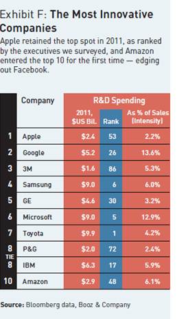 Booz的報名指,投入於研究與開發的費用多少,不是成功的主要因素;而是開發經費是否投資在人材、過程和器材上。換句話說,Apple能夠成功連續3年居首,是他們在開發上投資得其所。三家分別排名首、二、三位的企業Apple、Google和3M,均是連續3年位置不變。