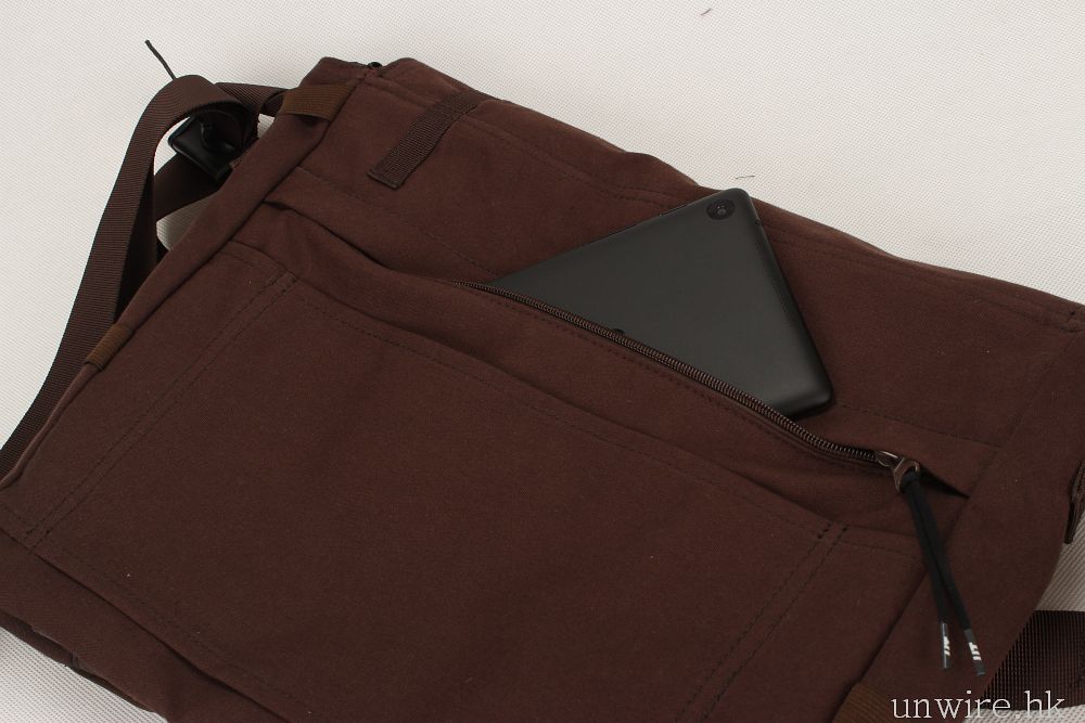 ▲背面的拉鍊暗格可擺放平板電腦 (圖中為 7.9 吋 iPad Mini)。