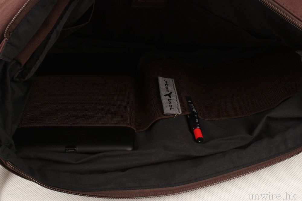 ▲ 內籠可擺放 13 吋或以下 Notebook,附魔術貼設計防止滑出,而上面備 2 個間格可擺放手機等物品。