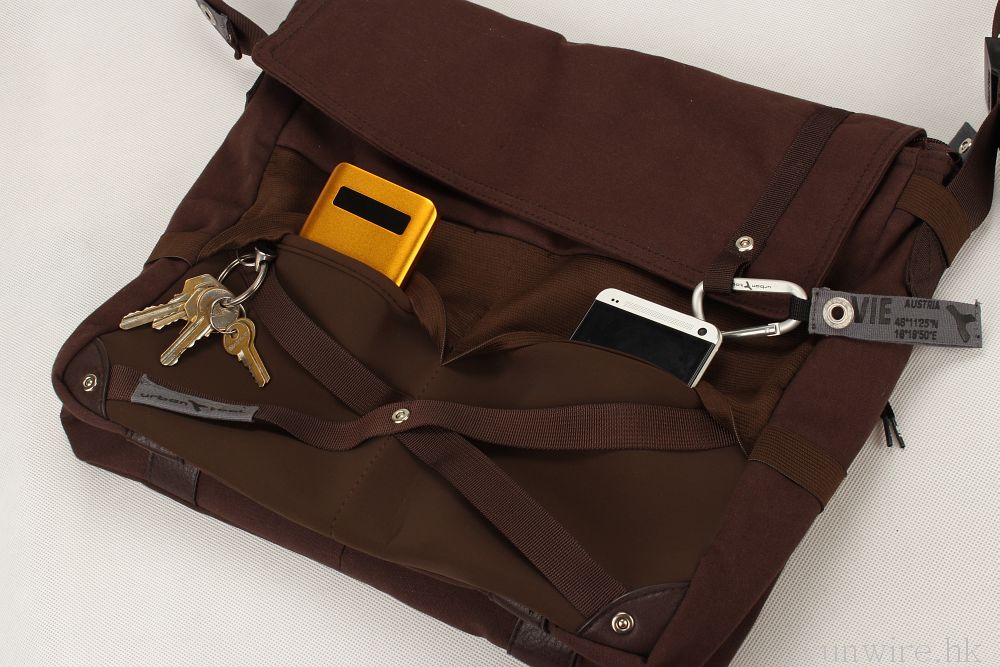 ▲ 正面設 2 個橡筋封口暗格可擺放手機等裝置,而左邊更藏有伸縮扣可串上鎖匙。