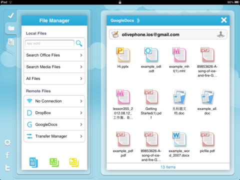 功能強大的一體式文件管理器, 一個界面解決所有問題,以及方便地雲存儲,搭載 “會議錄音機” 、“後台鬧鐘式事件提醒”、“便簽” 等功能。此 Apps 特意為 iOS 7 設計了扁平化界面風格。最重要是它有中文。