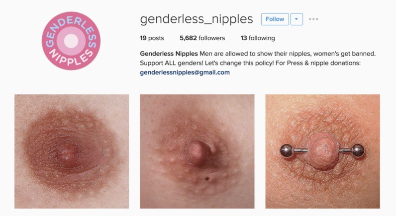 他們認為 Instagram 准許張貼男士乳頭的照片,但又禁止女士這樣做是不公平。於是在 Instagram 發起「Genderless Nipples 乳頭無性別」行動,要求網民關注 Instagram 偽善的立場,和修改相關的審查制度。他們發起要求男、女網民電郵乳頭的「大頭相」,讓他們在 Instagram 刊登。由 Genderless Nipples 刊登的照片看來,的確無法從相片中分辨性別。