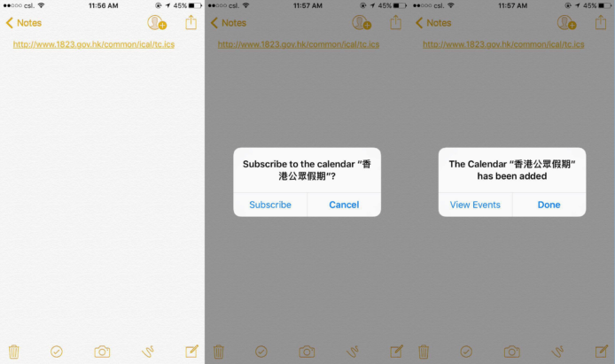 首先,用手機瀏覽器開啟本頁,然後按實這條連結,看見選單後按複製,將其貼上備忘錄之中,然後按完成,備忘錄會自動產生連結,一按便會彈出詢問是否訂閱月曆的視窗,按下訂閱即可將香港的公眾假期匯入至閣下的行事曆之中,省卻要從設定裡逐步加入的麻煩。
