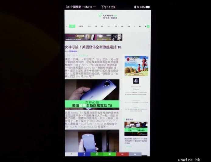 講完相機就講講熒幕啦,美圖 T8 採用了 5.2 吋 1080p 熒幕,材質為 Samsung 的 AMOLED 熒幕,好處是亮度較高、細緻度高、黑位夠實之餘,可視角度亦十分高。筆者試過瀏覽 unwire 主頁,無論是流動版或者電腦版網頁,文字都十分清晰,相片顏色亦屬自然向,味精感不太重。另外,可視角度確實很高,從側面睇都未見有變色變暗情況出現,以 3 千幾買部中價機有呢個熒幕質素,都合理啦。