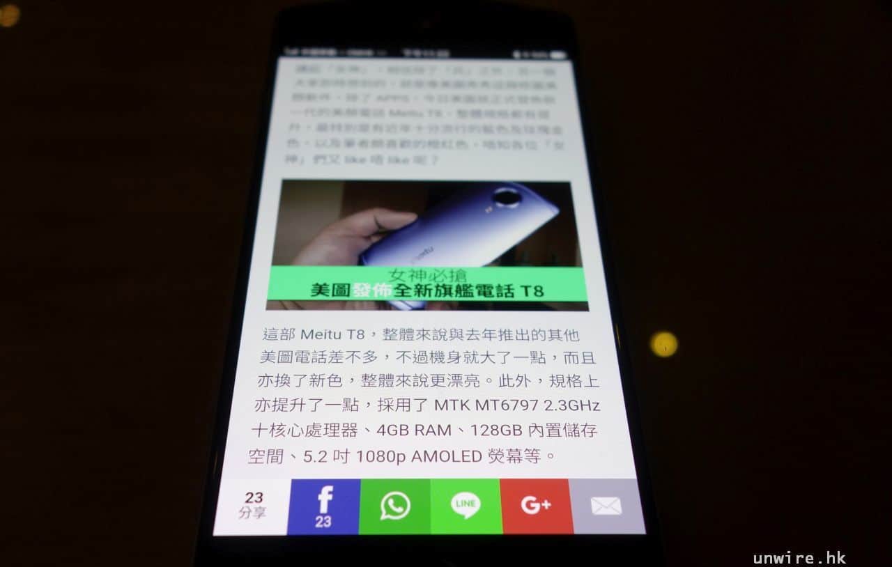 講完相機就講講熒幕啦,美圖 T8 採用了 5.2 吋 1080p 熒幕,材質為 Samsung 的 AMOLED 熒幕,好處是亮度較高、細緻度高、黑位夠實之餘,可視角度亦十分高。筆者試過瀏覽 unwire 主頁,無論是流動版或者電腦版網頁,文字都十分清晰,相片顏色亦屬自然向,味精感不太重。另外,可視角度確實很高,從側面睇都未見有變色變暗情況出現,以 3 千幾買部中價機有呢個熒幕質素,都合理啦。