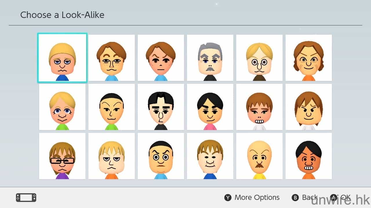 下一步就是設定頭像及名稱,選擇「Next」,之後選擇喜歡的頭像,大家可以選擇經典角色,例如:Mario、Zelda 等,亦可以選擇任天堂的 Mii 頭像。點按「More options」可以揀背景顏色。