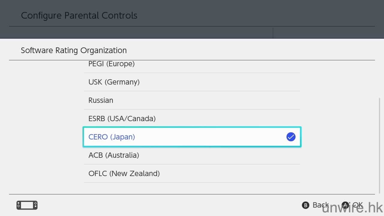 如果是家長買給小朋友玩,之後可以即時設定家長指引功能,如要設定先點按「Configure Parental Controls」(如果不用就直接按 Skip),之後大家如想在智能裝置上控制,可點按「Set on Smart Device」,如果想直接在機內設定,可點按「Set on Console」。前者的話,需要大家先在智能電話安裝「Nintendo Switch Parental Controls」APP,不過由於此機正常應是 3 月 3 日才推出,所以就暫時不能下載。所以大家如要設定,就唯有選擇後者。進入後,點按「Restriction Level」,大家可以選擇小朋友的年齡,它就會按程度禁止他們玩不符合他們年齡的遊戲。當然,大家都可以選擇「Customs」,按需要設定詳細內容,例如:不能玩什麼年齡以上的遊戲、評核等級的國家、甚至連可否貼文 / 圖上社交平台或與其他人溝通,都可以限制得到,十分詳細。完成後可按「Next」,之後就要設定一個 4 至 8 位數字的密碼,需要輸入兩次相同密碼。