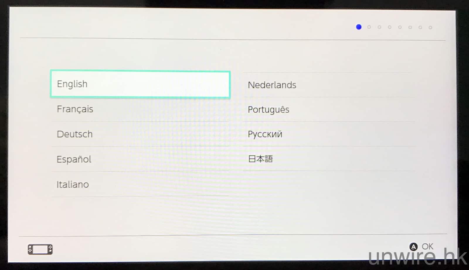 開機後首先會見到 Nintendo Switch 的短片,之後就進入設定語言,哈日族當然可以揀「日本語」,筆者就寧願揀「English(英文)」啦,比較可惜的是沒有中文介面。