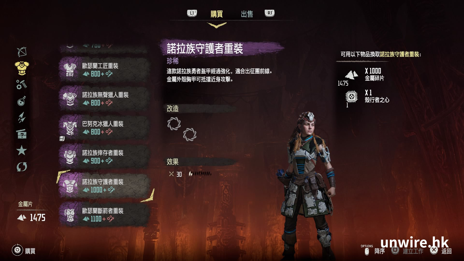 在Horizon的世界中, 人類利用殘存的高科技素材與取自機械生物的材料來武裝自己。主角的武器裝備除了用金錢購買,還需要配合原本裝置於機械生物上的零件。筆者的玩法,就是先在商人的物品清單中,瀏覽希望製作的裝備,裝備需要到甚麼零件,就在地圖上找出相應的機械生物,然後用「快速移動行囊」跳到目的地,廝殺取得所需的零件。