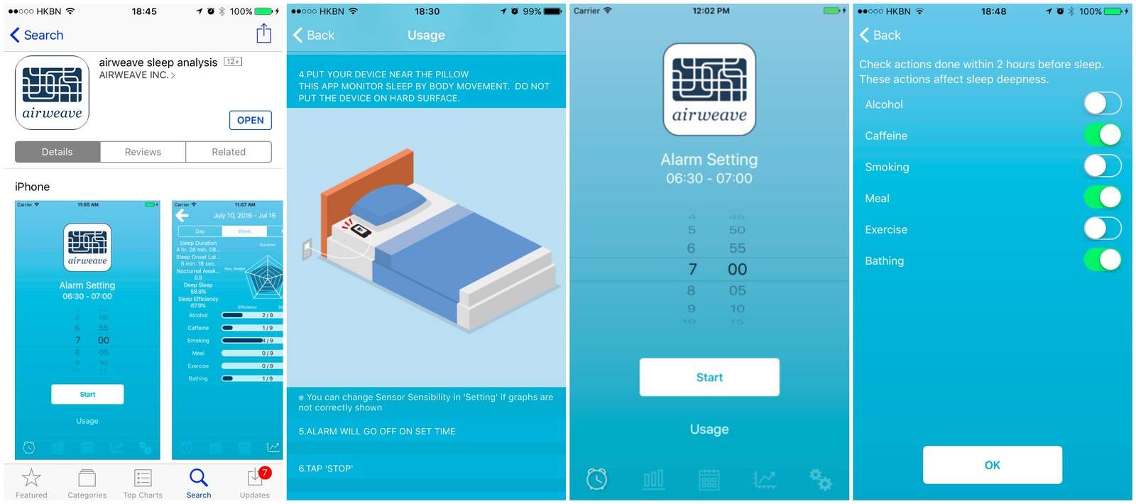 ▲下載咗個 App 之後(圖一),可先睇一睇說明:叫你開著個 App,差住電放枕頭旁(圖二);App 入面有得設定鬧鐘(圖三)及選填你嘅睡前活動(圖四)。
