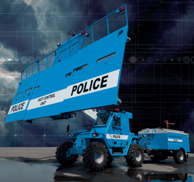 這架「警車」名為「Bozena Riot」在平時都似一部推土車,但看上去個子小小,卻能變成無堅不摧的移動長城。在它前面的人工牆壁,可由約一條行車線的闊度,延伸至接近三條行車線的巨牆,這幅巨牆重達3公噸。當然它是一部推土車,裝上這麼一幅巨牆後仍可自由移動。