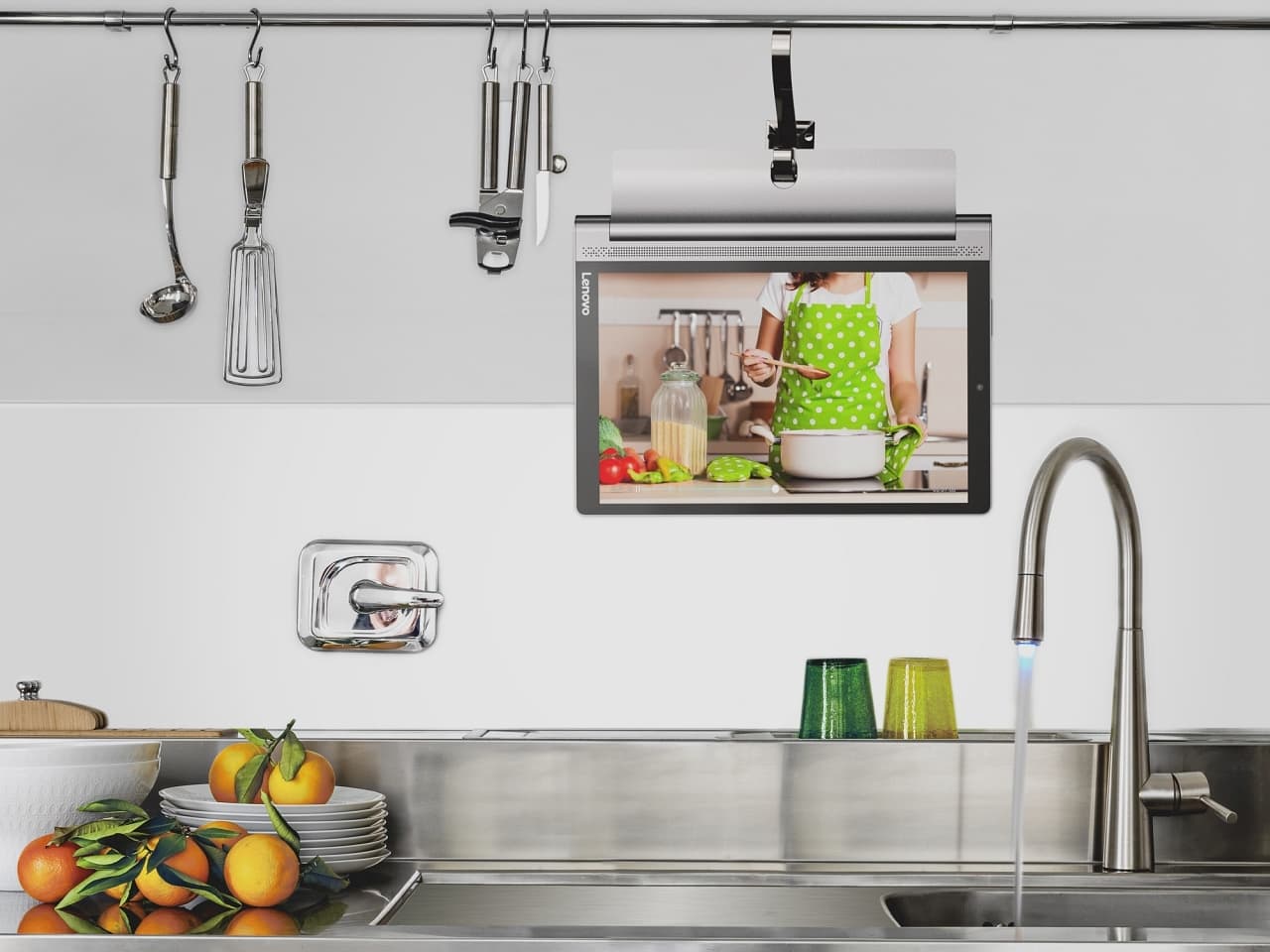 Yoga 系列的其中賣點,就是可以擁有多個不同的擺放方式,以配合不同的使用環境,今次除了常見的直立、手持和傾斜模式外,只需要打開機身背面的機關,更可以有掛牆使用,對於想邊煮飯邊煲劇的用家,就十分方便。這部機的機身還加入防水濺功能,減少因水濺所帶來的不便。