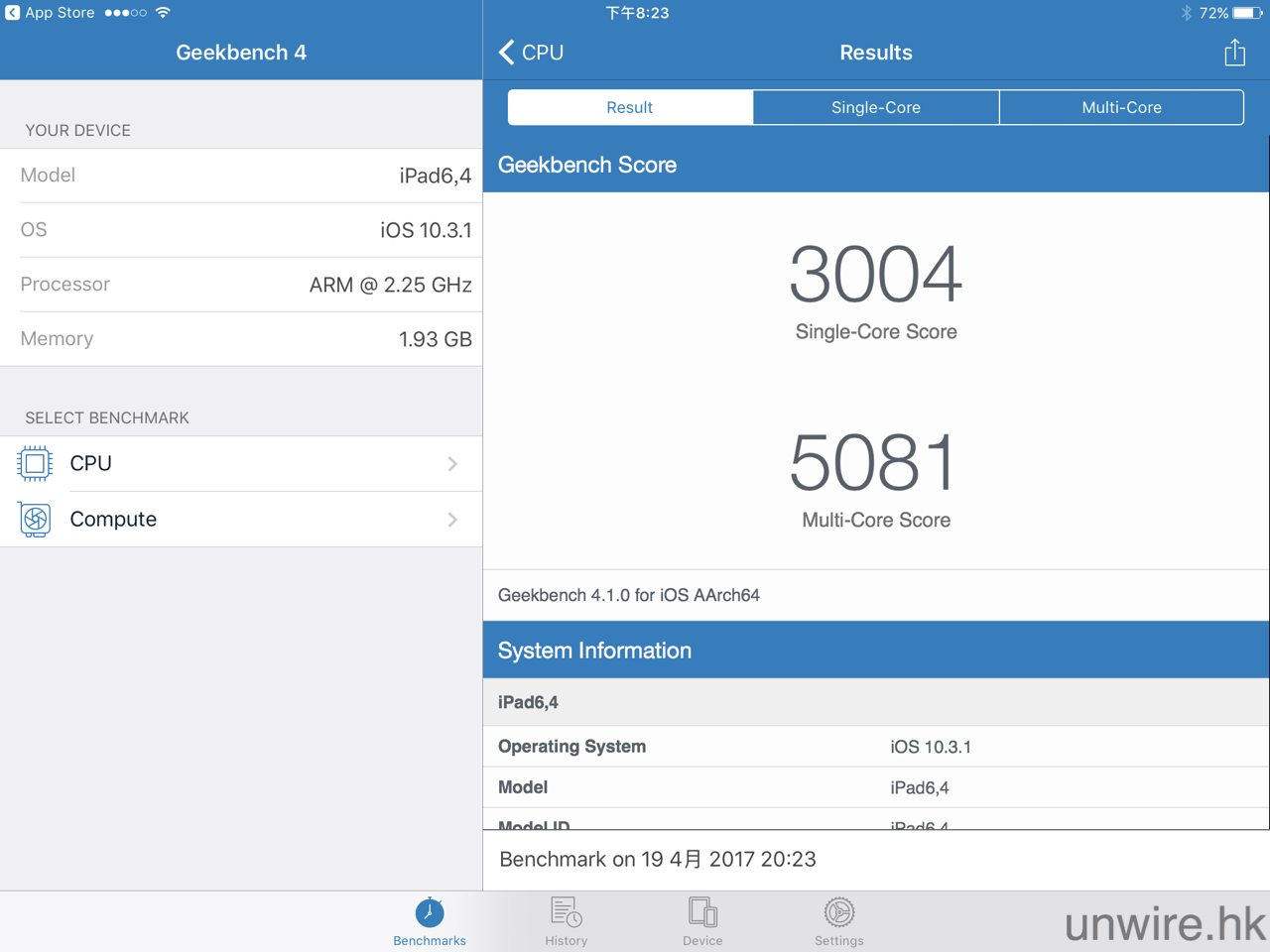 ▲再針對 iPad (2017) 及 iPad Pro 9.7 吋的處理器效能分別,以 Geekbench 4 的 CPU 項目進行測試,第一張可見 iPad (2017) 的 A9 處理器,在單核心及多核心的表現上只獲得 2,489 分及 4,429 分,而第二張可見 iPad Pro 9.7 吋的 A9X 處理器,單核心及多核心的表現就獲得較高的 3,004 分及 5,081 分,明顯效能分別比 iPad (2017) 高約 21% 及 15%。