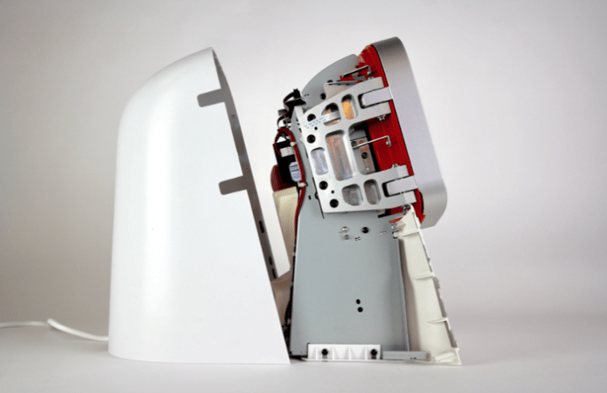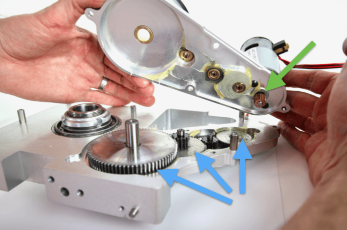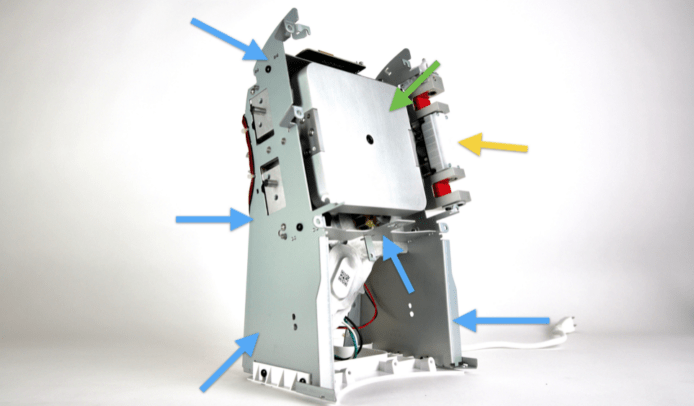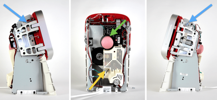 Juicero榨汁機需要配合自家出產的生果包,才能用此機榨出果汁,但就被Bloomberg(彭博)新聞踢爆,其實生果包只要用人手擠壓就能榨汁,毋須一部價值700美元的榨汁機。今次的拆機者Ben Einstein拆開主機後,已發現它採用的零件不惜工本。面蓋極為堅硬而厚,令榨汁機不易意外翻倒,裡面更有像拉絲金屬的花紋。