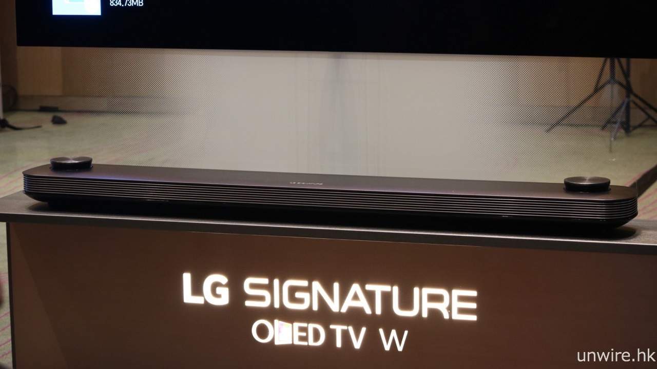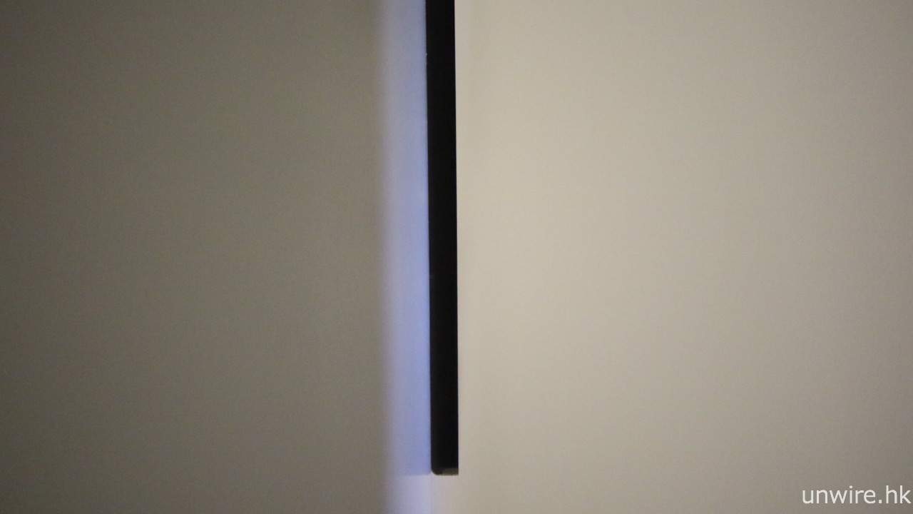 由於 OLED 能夠自行發光、無需背光系統,因此 OLED TV 一直以來已經有著機身纖薄的優點。來到今次提供 65 吋及 77 吋型號的 W7 系列,LG 就更進一步地將所有輸入端子「轉移」到影音外置盒連 SoundBar 系統之中,從而令 65 吋 W7 的機身可以僅厚 3.85mm,而 77 吋亦不過為 5.96mm,即場觀看確實較以往的 LG OLED TV 進一步纖薄。另外有別於傳統電視,W7 兩款型號都不設座檯底座,必須掛牆使用,而 LG 亦為這個系列炮製了緊貼牆身的特製磁石支架,只需簡單地將熒幕「貼上」支架,安裝即告完成。