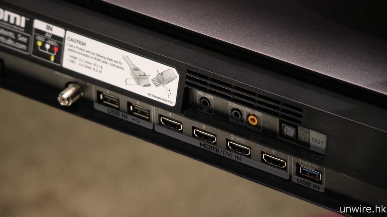 ▲ 共設有 4 組 HDMI、3 組 USB 輸入、3.5mm AV/色差輸入,以及光纖輸出端子。
