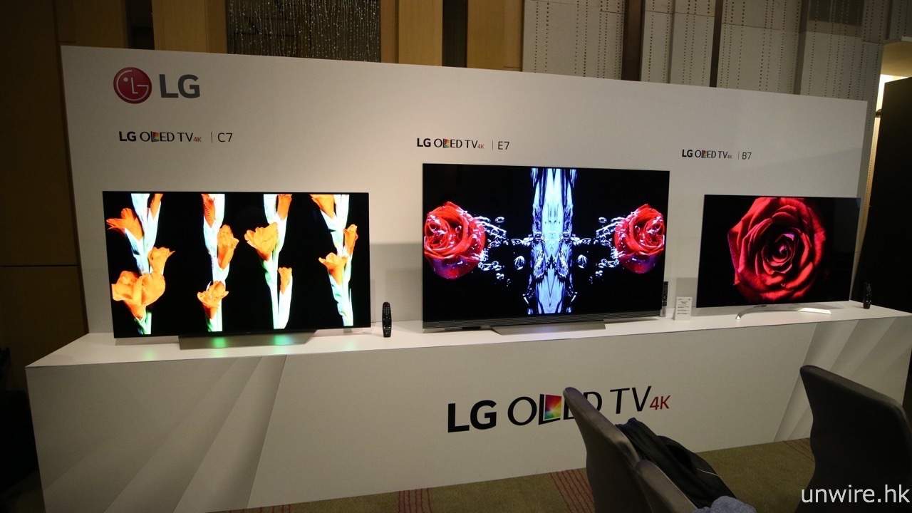 ▲ 除 W7 之外,LG 亦同時發佈 4K OLED TV E7、C7 及 B7,前者設有 65 吋型號,搭載 4.2 發聲單元,而後兩者則為 2.2 單元,當中 C7 設有 55 吋及 65 吋型號,並用上梯形底座,而 B7 則只設 55 吋型號,底座為新月型設計。