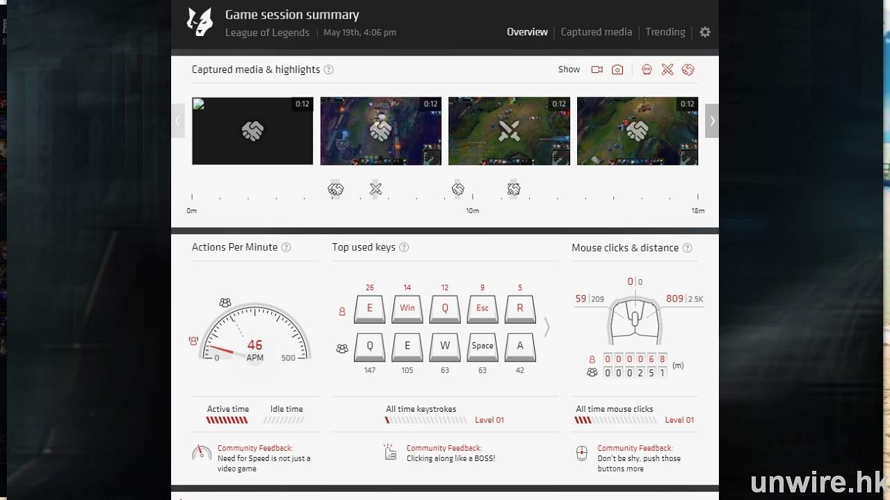 ▲透過 OverWolf 的幫助,在遊戲後就可以查看到在遊戲過程中不同按鍵的按鍵次數、速度與及錄下遊戲中精彩部份。
