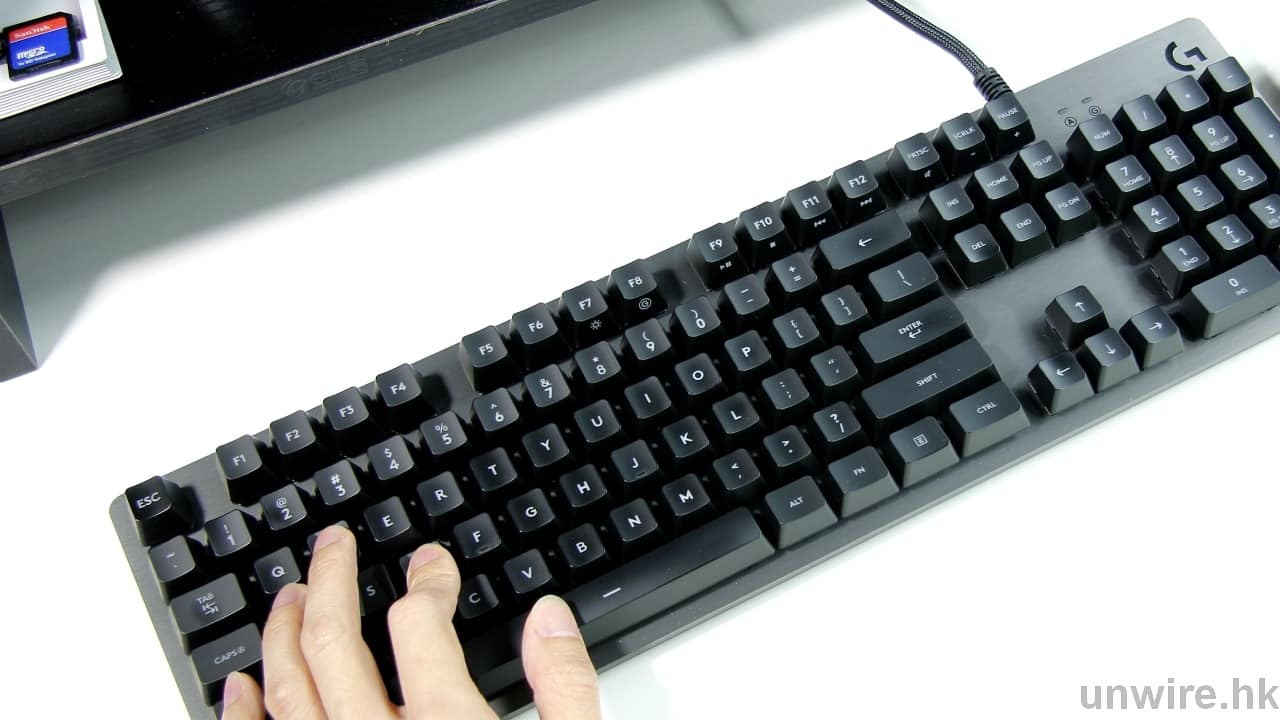 Romer-G 比起其他機械軸還有一個優點,就是當中的透光感更強更「實淨」,因為可以看到按鍵採用「中空」設計,與平時常見的「十」字機械軸不同,因此底部的 LED 燈光可能直接穿透鍵帽,更光並大大減少光散的問題。Logitech 今次更為 G413 的用家帶來貼心的「禮物」,除鍵盤附送拔鍵器和 12 個在遊戲中較常用到的按鍵,並採用八字形切割技術,有助玩家的手指擺放在合適的位置,減少在遊戲中因誤按其他按鍵而出錯的機會。至於手感方面,按鍵時的聲音亦較少,適合大家在夜深時打機。要與一般機械軸比較的話,Romer-G 會比較接近茶軸。