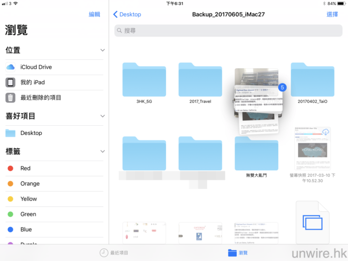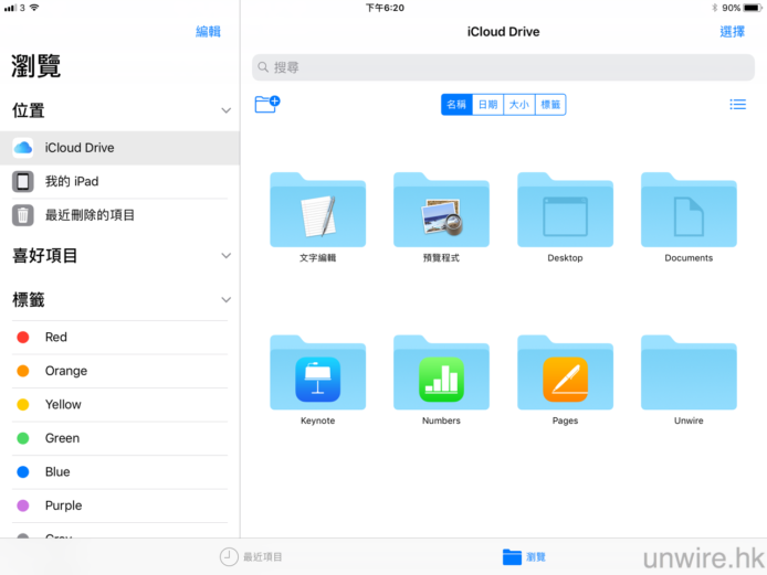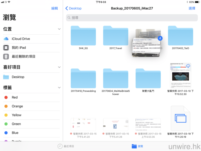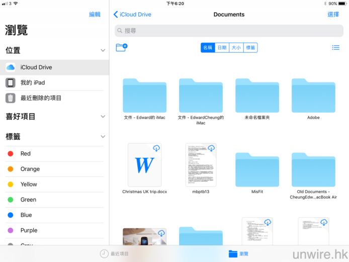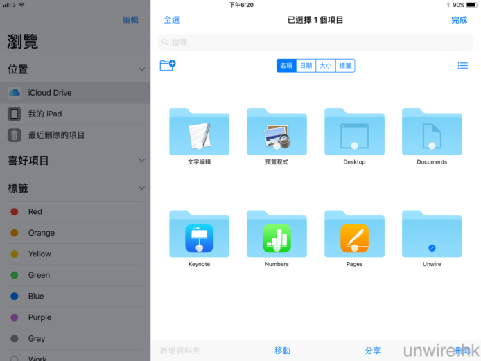 ▲點按著某檔案不放後可以叫出次目錄,之後用家可以選擇「複製」、「重新命名」、「移動」、「分享」、「標籤」、「資料」及「刪除」,當中如選擇了標籤,就可以為檔案分門別類,之後這些檔案亦可以在第一頁「最近項目」中看到它們。