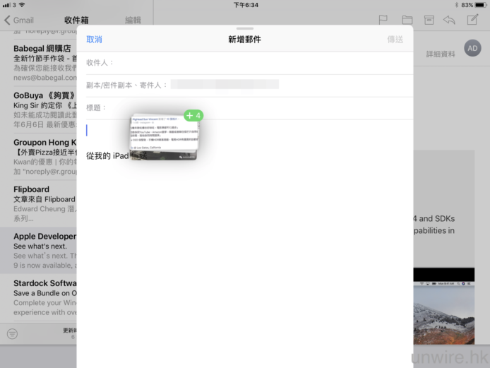 ▲進入電郵 APP 後,開啟希望將附件加入至的電郵,又或者新建郵件,然後將檔案拖拉至內文空白位置再放手。