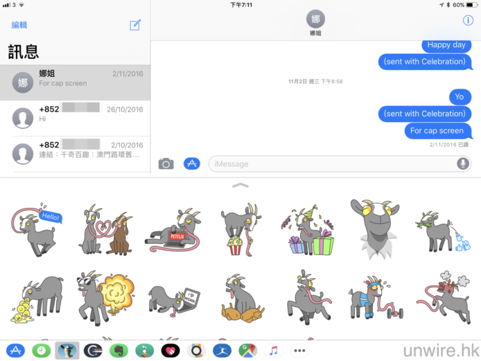 還記得去年推出 iOS 10 時,iMessage 功能已被強化了不少,尤其是加入了貼紙功能,又加入了一些表達感情的動畫,確實令它吸引力大增。今年的 iMessage,在發佈會中 Apple 就宣佈可以結合 Apple Pay 做到「過數」結親友的功數,而錢就可以存到 Apple Pay 卡或者直入銀行戶口。當然,這需要銀行支援,所以現在就未能為大家測試了,不過今次 iOS 11 中的 iMessage,亦加入了新功能,就是會自動感應用家下載了甚麼第三方軟件,然後在 iMessage 中自動加入與這些 APPS 有關的貼紙,雖然沒有甚麼實際功能,純粹是 for fun,但都叫做有多些東西玩吧?
