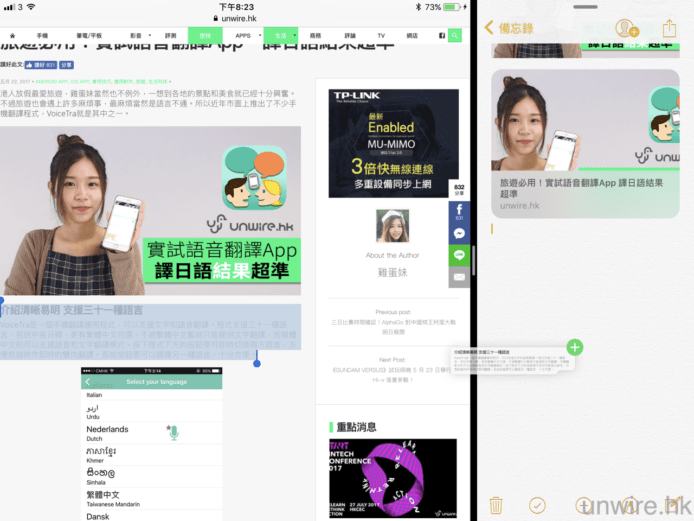 ▲另一個例子,就是當以 Split Screen 模式雙開程式時,要將 Safari 中的瀏覽內容,抄寫到另一邊的 Notes,以相片為例,只需要按住相片之後拖拉到 Notes 一方就可以了。
