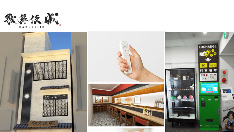 「歌舞伎城」位處於歌舞伎町哥斯拉路(ゴジラロード)內,樓高三層連地庫,外古混入古城建築風格。當中地面一層屬於共用工作空間,旅客可於此處自由休憩;二樓及三樓則是和風居酒屋「宴」所在位置,提供各種地道日本美食、日本酒及獨有特產等;地庫「寺子屋」則會定期舉行書法、茶道及和服體驗等活動,讓訪日外國旅客體驗到日本傳統特色。