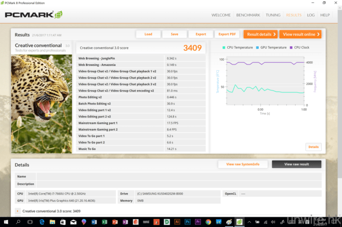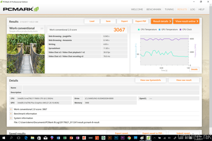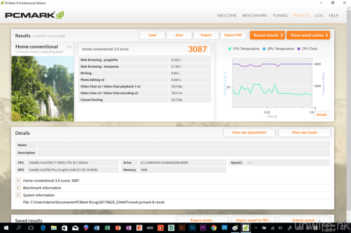 在效能方面,筆者都略為說說吧。今代 NSP 採用了最新的硬件配備,包括:Intel 第七代 Kaby Lake Core m3 / i5 / i7 處理器、4GB / 8GB / 16GB RAM 記憶體、Intel HD 615(m3)/ HD 620(i5)/ Iris Plus 640(i7)內置顯示晶片及 128GB / 256GB / 512GB / 1TB SSD 儲存空間,而筆者手上的受測機款,就採用了 Intel Core i7-7660U 2.5GHz 處理器、16GB RAM 記憶體、Intel Iris Plus 640 內置顯示晶片及 512GB SSD 儲存空間,以不同效能測試軟件測試過它的表現,均有不錯的結果,如果用來一般使用或者進行簡單到中等複雜程度的圖像或影片處理,基本上 NSP 應付上都是游刃有餘的,唯一是因為它採用了內置顯示晶片,所以用來打機或進行較複雜的圖像、甚至 3D 圖像、4K 影片處理,在 rendering 上可能會有點吃力了,不過對於絕大部分用家來說,這部機的效能都是足夠應付有餘的。