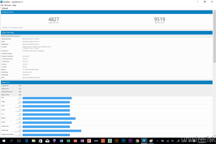 ▲先以 Geekbench 4 測試它的處理器效能,單核心及多核心處理,分別獲得 4,827 分及 9,519 分,算是不錯。