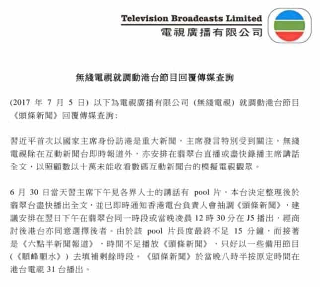 據無綫表示由於習近平首次以國家主席身份訪港,因此其發言特別受外界關注。雖則當時他們已經在互動新聞台及翡翠台進行直播,但由於要照顧未能收看數碼模擬電視觀眾,因此最後他們決定在整理好習近平的講話後盡快播出,並指出事前已經通知港台負責人會抽調《頭條新聞》,而雙方亦同意改在當晚凌晨 12 時 30 分在 J5 播出。此外,由於主席講話不足 15 分鐘,而剩餘時間又不夠播放《頭條新聞》,因此無綫只好以備用節目 《順峰順水》去填補時間,並不存在香港電台所指的只播放風水節目。