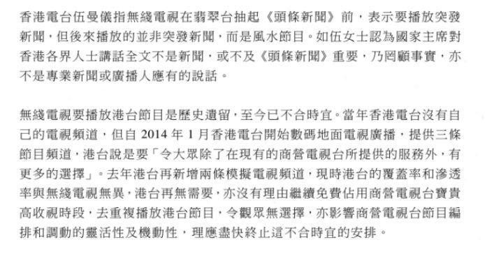 無綫認為外界指習近平講話並非突發新聞,或不及《頭條新聞》重要乃罔顧事實。同時聲明強調無綫電視要播放港台節目,是由於當年港台沒有自己的電視頻道,只是歷史遺留下來,至今已不合時宜。不過自 2014 年電台開始數碼地面電視廣播,再加上去年再新增兩條模擬電視頻道,港台的覆蓋率及滲透率已與無綫電視無異。因此無綫認為港台已經無需要,亦沒有理由繼續免費佔用商營電視台播放時段,並重複播放港台節目,令觀眾沒有選擇。