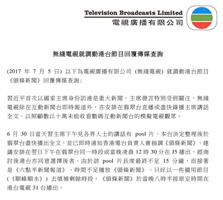 據無綫表示由於習近平首次以國家主席身份訪港,因此其發言特別受外界關注。雖則當時他們已經在互動新聞台及翡翠台進行直播,但由於要照顧未能收看數碼模擬電視觀眾,因此最後他們決定在整理好習近平的講話後盡快播出,並指出事前已經通知港台負責人會抽調《頭條新聞》,而雙方亦同意改在當晚凌晨 12 時 30 分在 J5 播出。此外,由於主席講話不足 15 分鐘,而剩餘時間又不夠播放《頭條新聞》,因此無綫只好以備用節目 《順峰順水》去填補時間,並不存在香港電台所指的只播放風水節目。