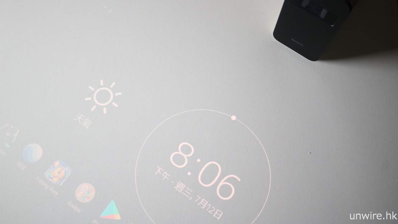 至於規格方面,Xperia Touch 用上 3 片式 SXRD 投影面板,面板解像度為 1,366 x 768,而光源則用上亮度為 100 流明的鐳射二極管,實試在一般室光環境下座檯投影至白色方形桌子,投影出的 23 吋畫面亮度充足而且顯示清晰。另外,Xperia Touch 亦搭載自動雷射對焦功能,在投影畫面至牆壁時,就可由投影機作自動對焦,無需用家作任何手動微調,十分方便。這部投影機內置 32GB 儲存空間,亦支援 MicroSD 記憶卡作擴充,並設有可充電池,但連續播放影片的話續航力大約只有一小時,一般情況還是建議接駁充電器使用吧。