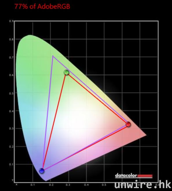 ▲色域方面,同樣以 Spyder 5 測試後,見到 Adobe RGB 只有 77%,尤其是綠色方面的表現比較弱,這是比較可惜之處。