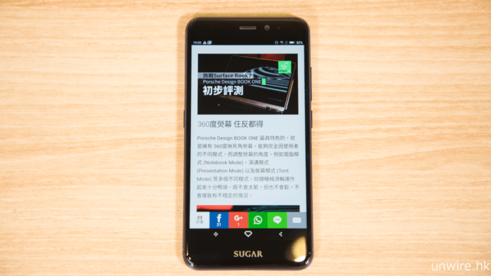 Sugar Y9 熒幕雖為 5.5 吋,但無奈顯示器只有 1280 x 720 的 IPS 熒幕。擁有 5.5 吋的大熒幕下,很容易看見熒幕銳利度不足,當然在一般的看影片,文章等多項日常常用工作時,問題不算太大,而且在頁面操作時,會有窒機的情況,但無奈 Sugar Y9 效能較普通,少不免會有窒機的情況。