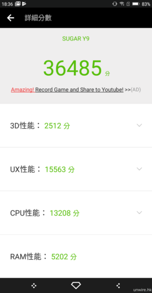 ▲在安兔兔評測測試中,只得 36485 分,絕對是入門級機,相信要用它來玩遊戲就會不太夠力,但只用作一般社交網絡,日常使用就不會有太大問題了。